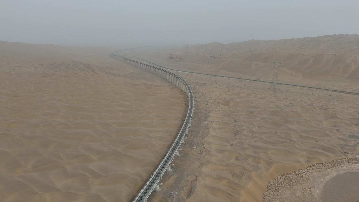 这是在库姆塔格沙漠流沙区中的敦煌铁路沙山沟特大桥。(陶琳 摄)