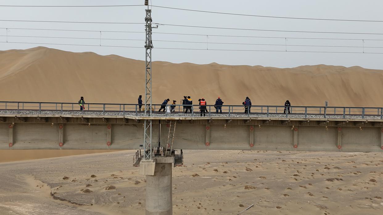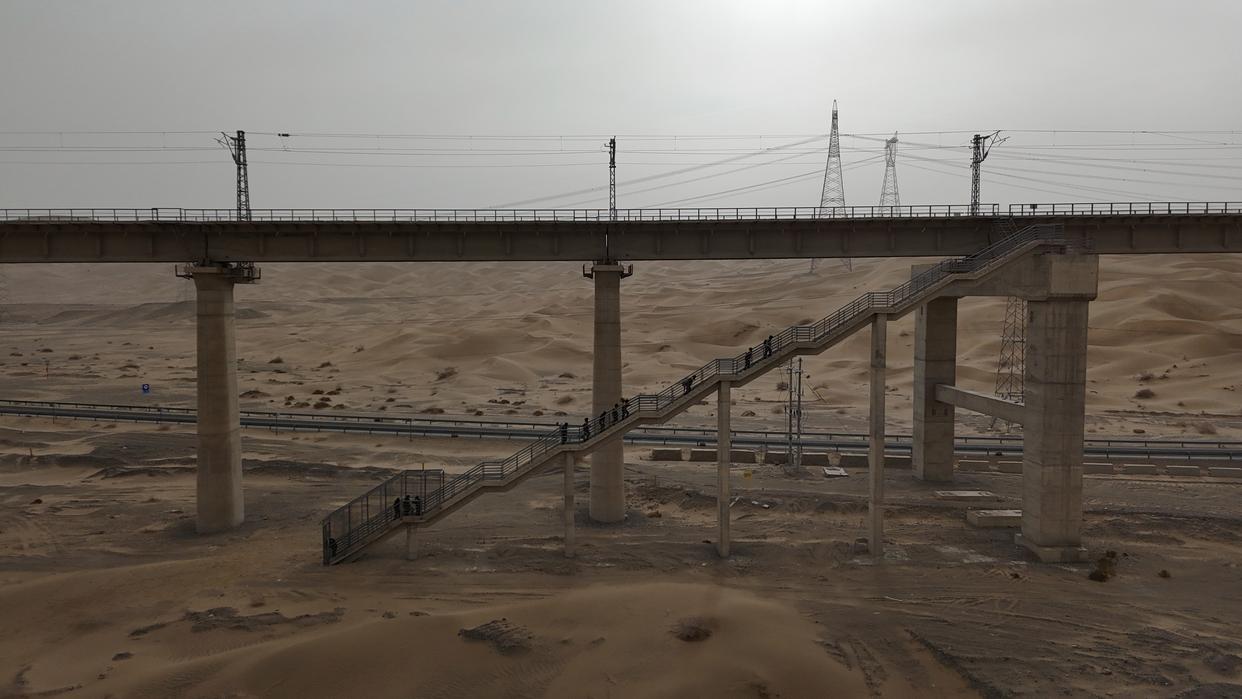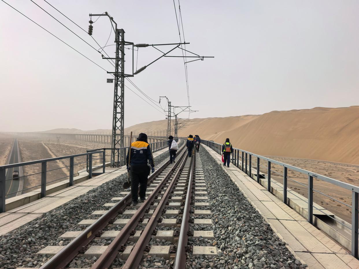 梁锦龙的目的地是沙山沟特大桥。大桥全长10.6公里,324个桥墩在库姆塔格沙漠流沙区中矗立,桥面最高处达33.6米,和11层楼一样高,是全线重难点控制工程。
